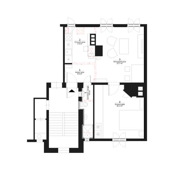 Koplietošanas platības pievienošana dzīvokļa platībai, starpsienu demontāža, ārsienu siltināšana ar kokšķiedras plāksnēm.
